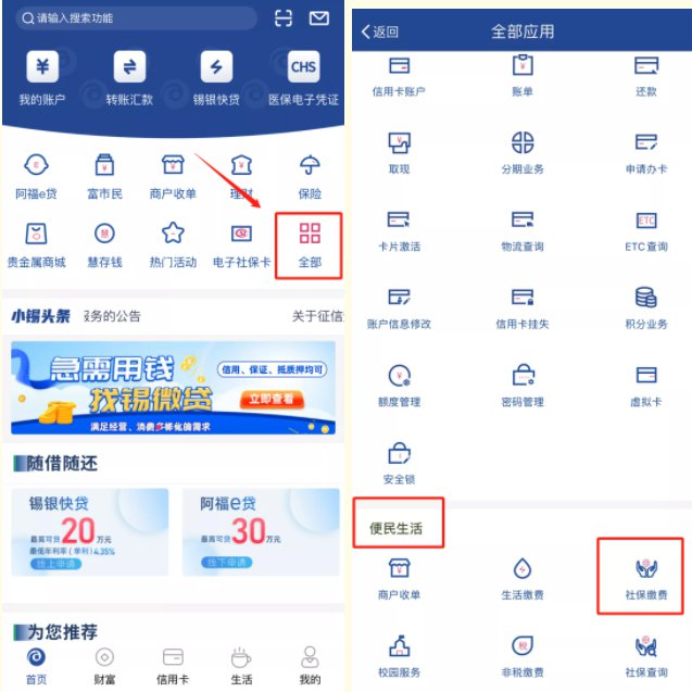 1.登录无锡农村商业银行手机银行,点击【全部】模块下的【便民生活】→【社保缴费】。