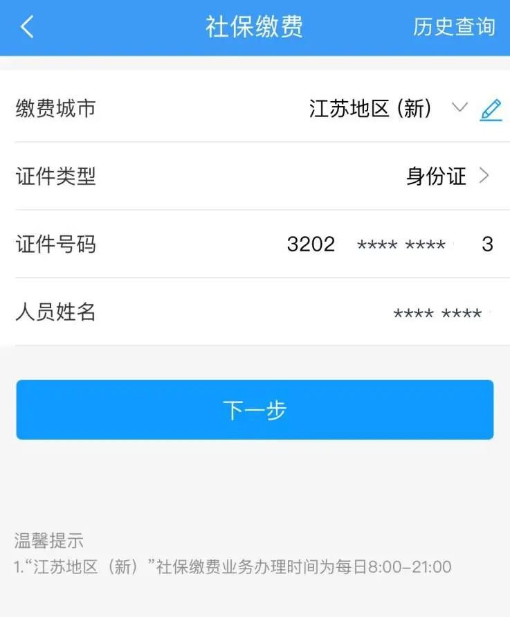 3.江苏银行将显示税务系统反馈的缴费信息,客户选择缴费人员编号(医疗保险费代码为8位)、 “缴费类型”(城乡居民)、“险种类型”(城乡居民基本医疗保险)、“缴费状态”(特殊缴费)等要素后,点击“下一步”进行社保费用的缴纳扣除。