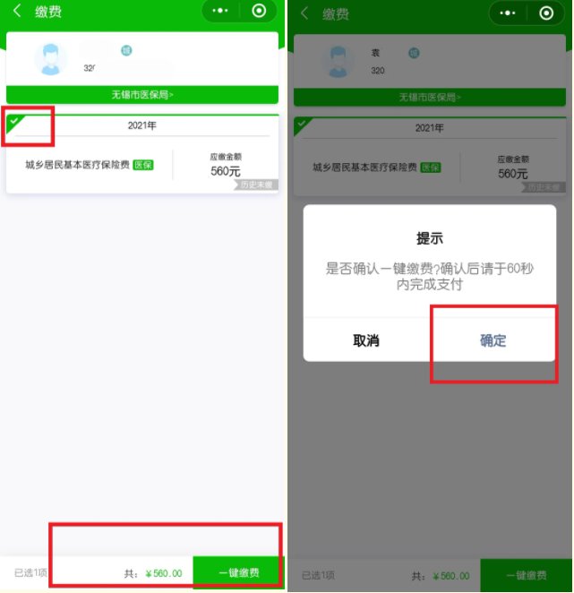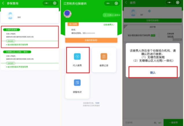 3.选中需缴费人员后,点击查询参保及应缴信息,选择对应的经办机构(城乡居民基本医疗保险对应的经办机构为无锡市医保局)。点击【缴费】或【代人缴费】查询出档次信息及待缴费数据,确认待缴数据,勾选并点击【一键缴费】,支付成功即完成缴费。