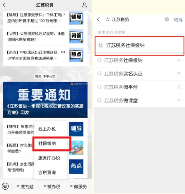 1.关注“江苏税务”微信公众号,进入公众号点击“微办税”,选择“社保缴纳”进入“江苏税务社保缴纳”小程序;或在微信内直接搜索进入“江苏税务社保缴纳”小程序。