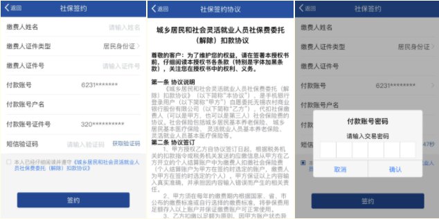 3.进入社保签约界面,输入“姓名”“证件号”,确认个人信息无误后,获取验证码,阅读并勾选“本人已仔细阅读并遵守《城乡居民和社会灵活就业人员社保费委托(解除)扣款协议》”,点击【签约】,系统将要求验证您的银行卡交易密码。