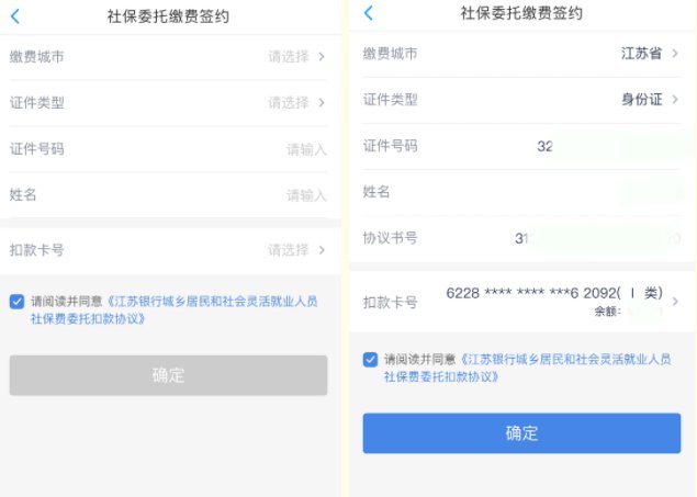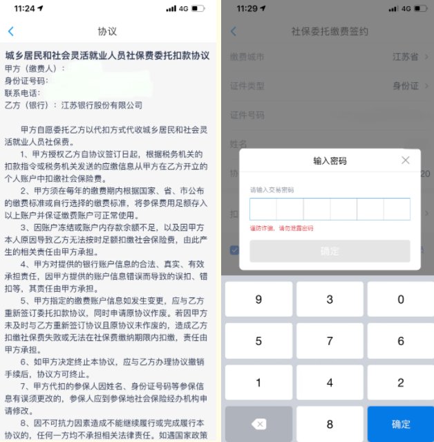 4.阅读并勾选“江苏银行城乡居民和社会灵活就业人员社保费委托扣款协议”选项,点击【确定】,系统将要求验证您的银行卡交易密码。
