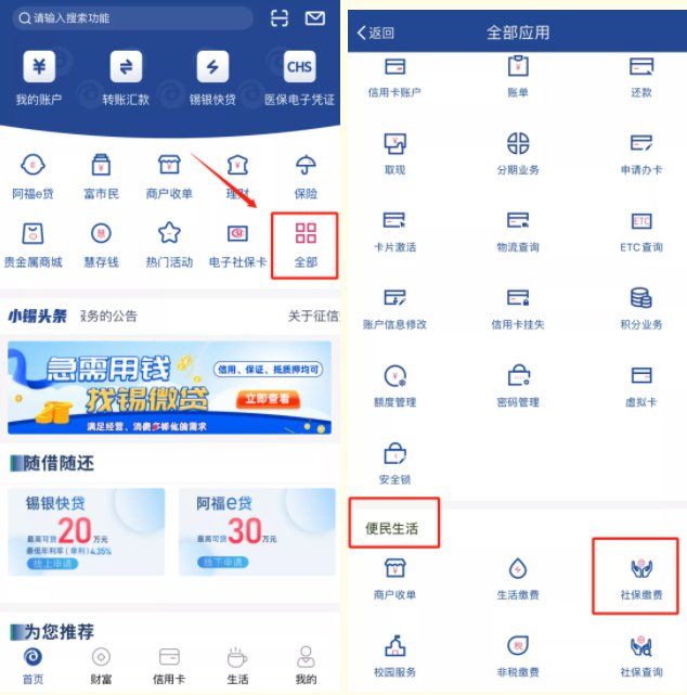1.登录无锡农村商业银行手机银行,点击【全部】模块下的【便民生活】→【社保缴费】。