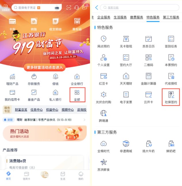 1.打开江苏银行手机银行,选择【特色服务】→【社保签约】。