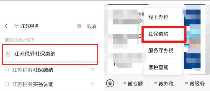 1.关注“江苏税务”微信公众号,进入公众号点击“微办税”,选择“社保缴纳”进入“江苏税务社保缴纳”小程序;或在微信内直接搜索进入“江苏税务社保缴纳”小程序。