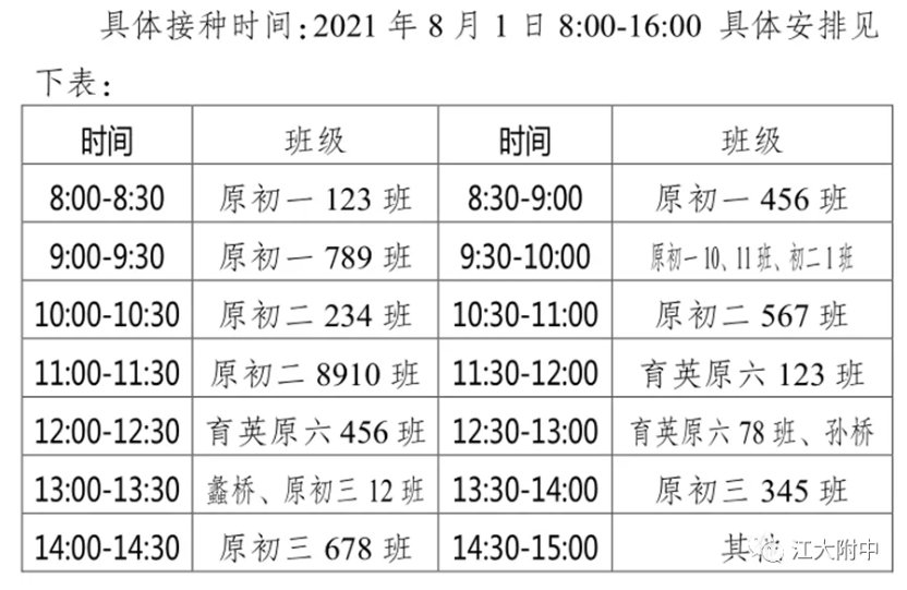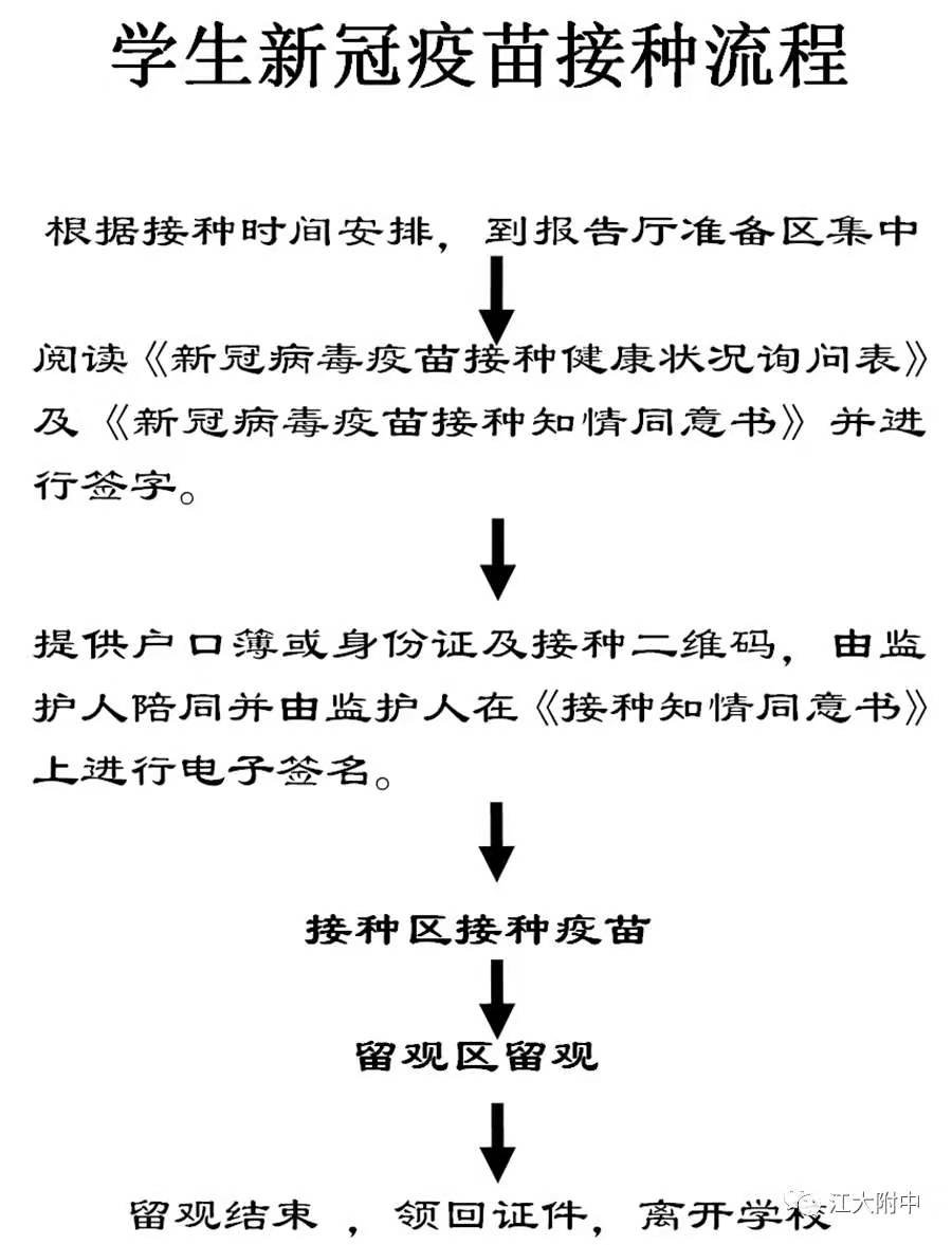 请家长和学生佩戴好口罩,扫码、测温进入江大附中。请带好笔、户口簿或身份证,如有病忌,请带好病历卡。当天接种人数众多,为了安全、有序、高效完成接种工作,请家长务必按照要求做好前期准备工作、带全相应资料、准时到达江大附中。感谢您的支持和配合!