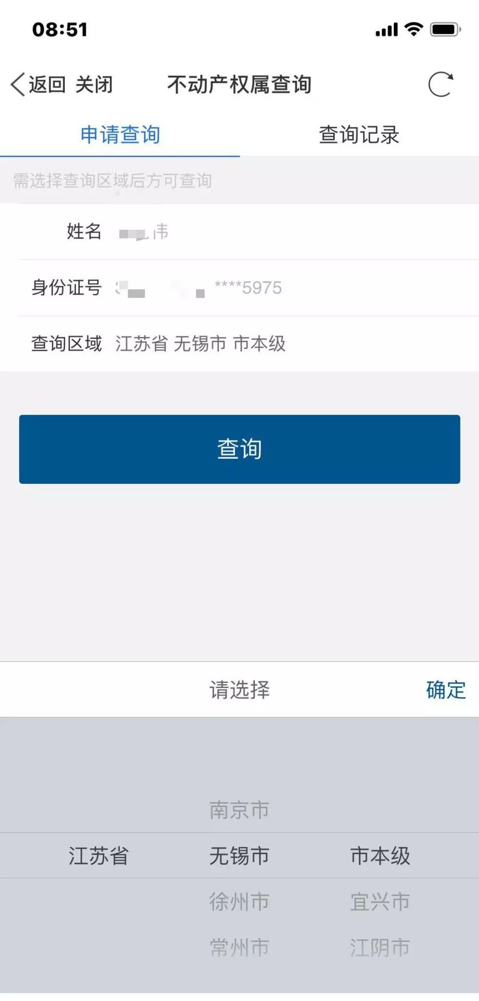 实名认证后,姓名和身份证号码无需输入,直接选择无锡市-市本级即可点击查询。
