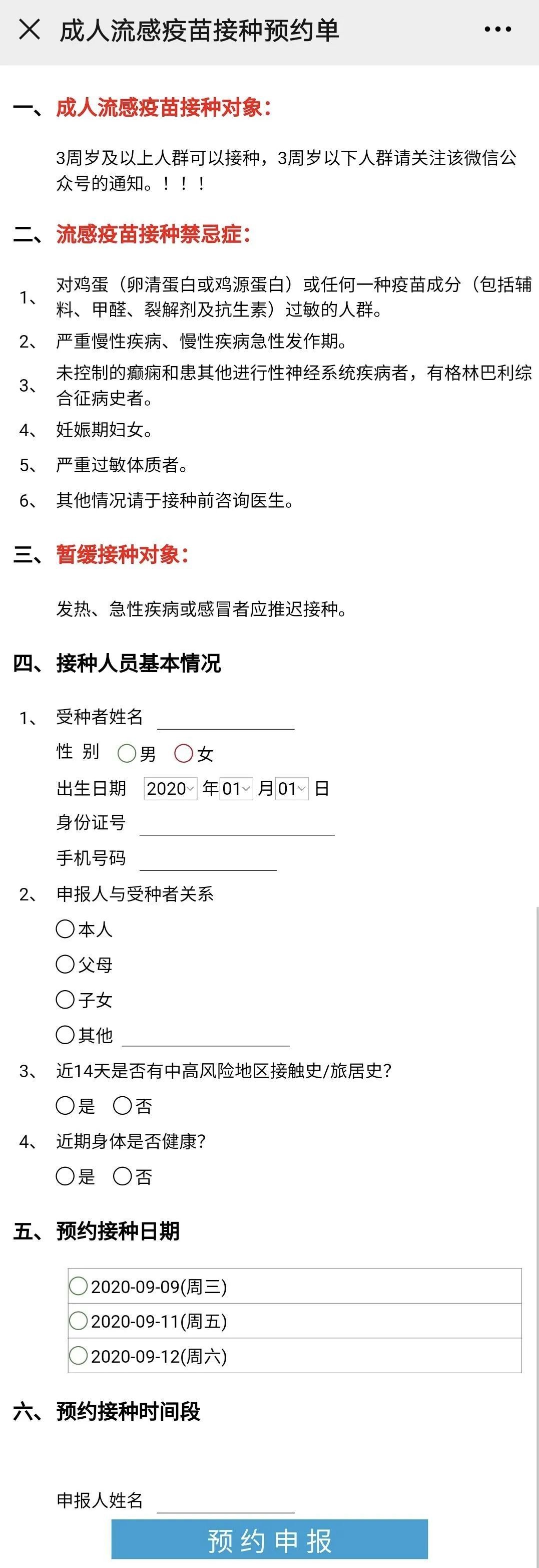 成人流感疫苗接种(每周一开通预约;每周三、五、六接种)
