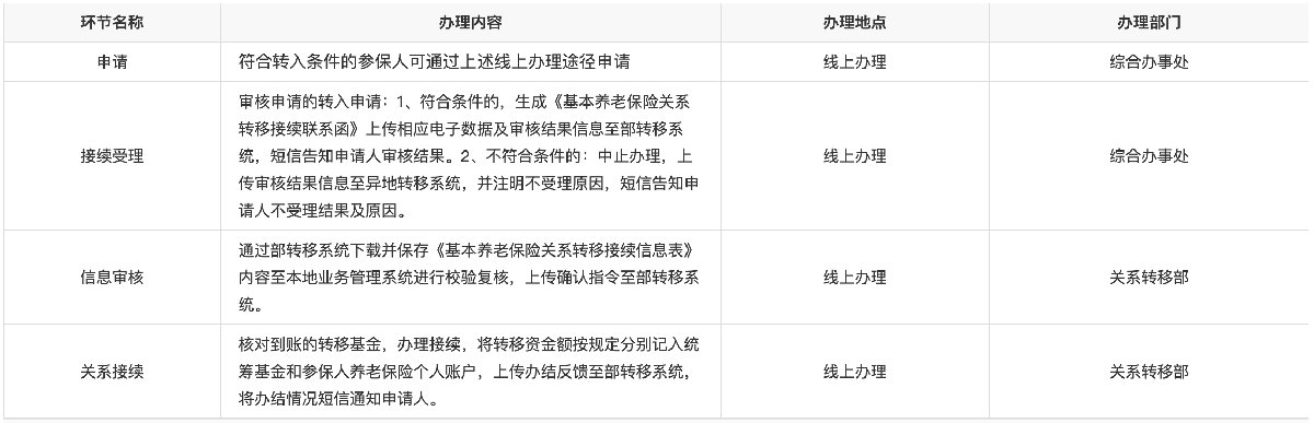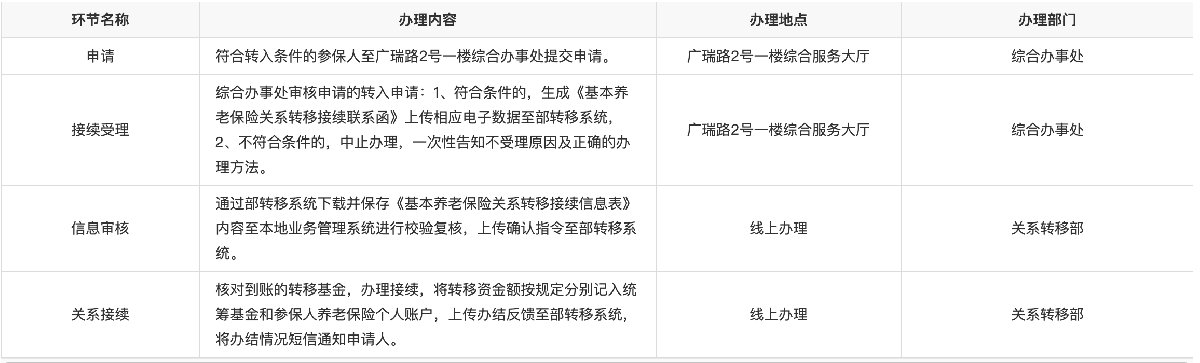 注:目前只受理制度内跨省的养老转入的业务,制度内省内的养老转入业务从2020年7月1日起,在我省人力资源社会保障一体化信息平台投入运行前,参保人员在省内跨统筹区流动就业参加缴费的,原参保地社保经办机构可将其基本养老保险关系和个人账户封存,个人帐户按规定计息,待参保人员达到待遇领取条件时,向待遇领取地社保经办机构提出转入申请。