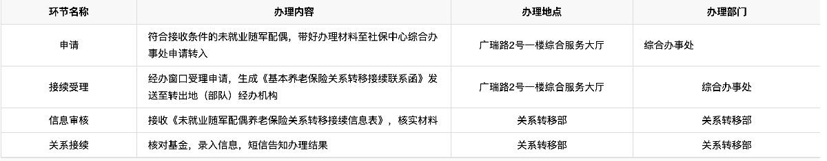 承诺期限:从受理养老保险关系接续申请到发出《基本养老保险关系转移接续联系函》:15个工作日内办结;从接收《未就业随军配偶养老保险关系转移接续信息表》及资金到账办毕接续手续:15个工作日内办结。