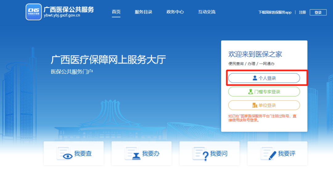 1. 登录广西医疗保障网上服务大厅(https://ybwt.ybj.gxzf.gov.cn),点击右上角【登录】—【个人登录】,输入个人账号、密码、图形验证,点击【登录】。