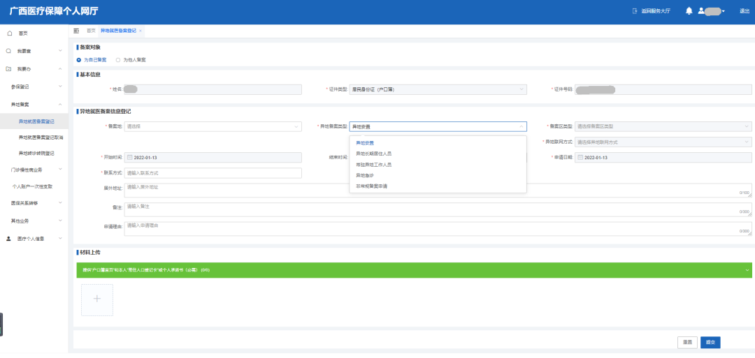 *提供的派出证明、工作证明、工作合同必须注明工作地点。参保单位集中办理常驻异地工作人员异地备案的,登录广西医疗保障网上服务大厅,进入单位网厅自助办理。