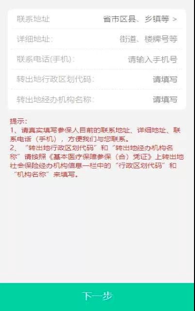 在新的界面中,参保人需如实填写当前所在地址和联系电话(手机)。“转出地行政区划代码”和“转出地经办机构名称”必须按照《基本医疗保障参保(合)凭证》上转出地社会保险经办机构信息一栏中的“行政区划代码”和“机构名称”来填写。