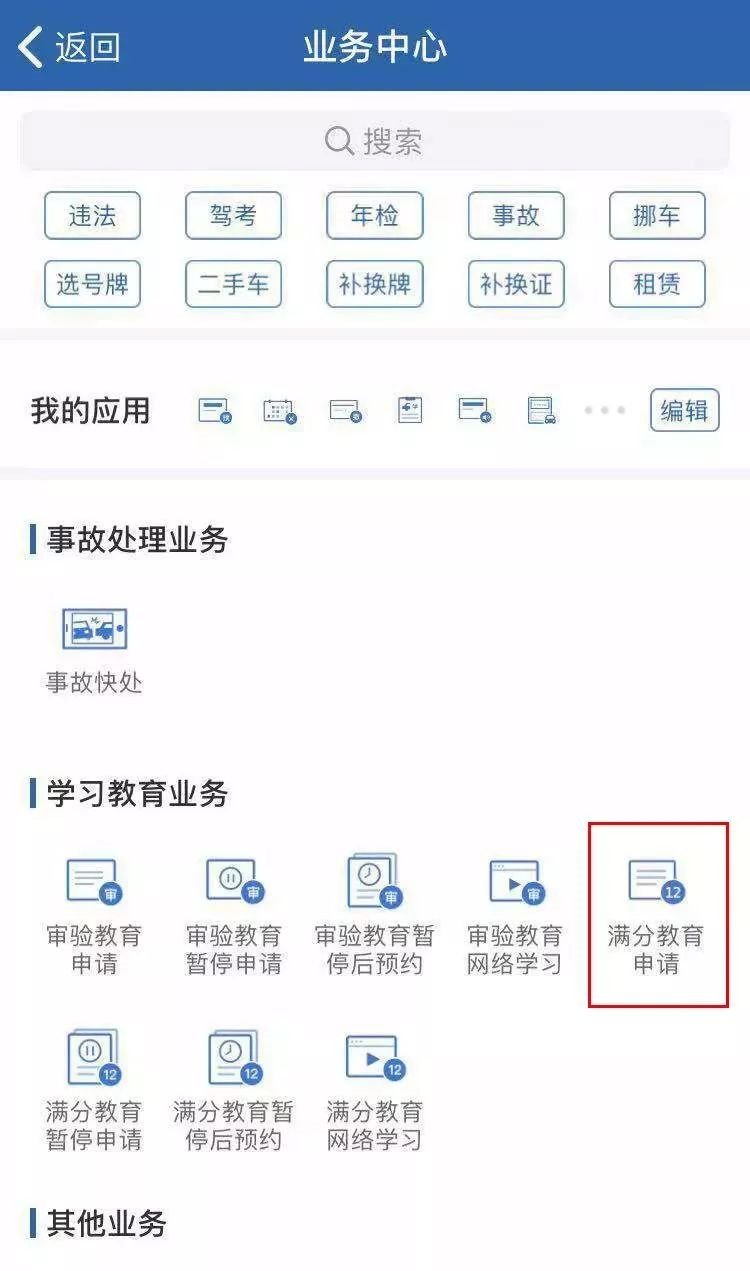 下载“交管12123”手机App ,注册登录后选择【满分教育申请】
