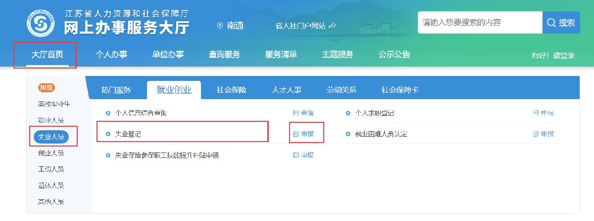 1、线上申报:既可通过支付宝或微信进入“电子社保卡”小程序的“失业登记”模块,也可通过“江苏人社网上办事服务大厅”(点击进入)进入“大厅首页—我是失业人员—热门服务—失业登记”或“个人办事—就业创业—就失业登记—失业登记”进行申报。
