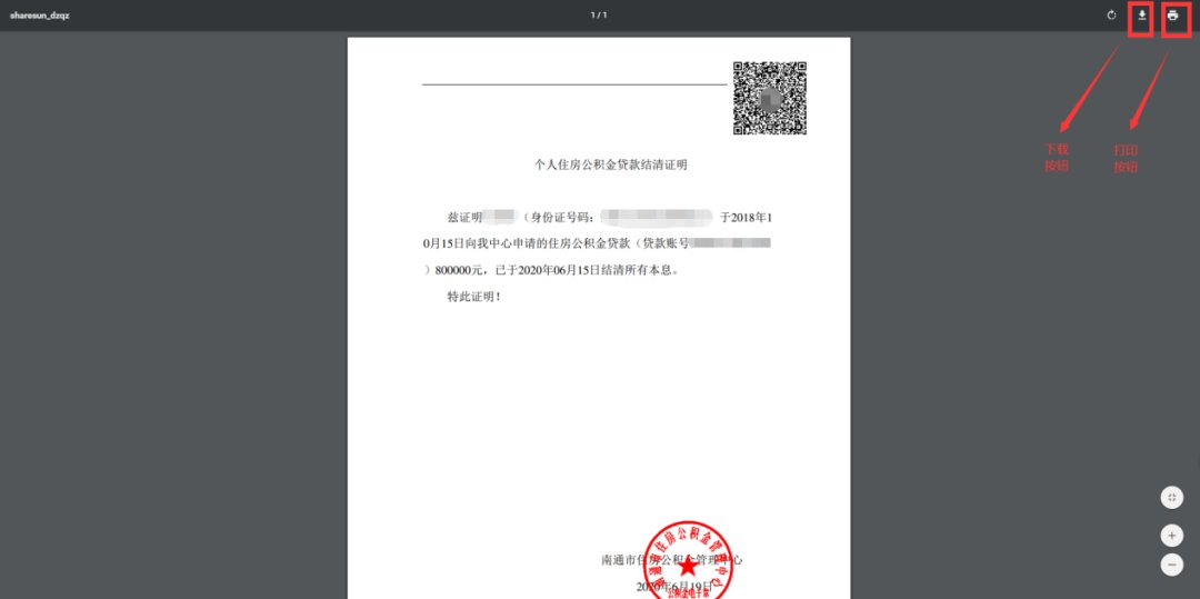 点击【查看凭证】按钮,会跳转至贷款结清证明pdf页面,用户可根据需要选择下载或打印如下图所示: