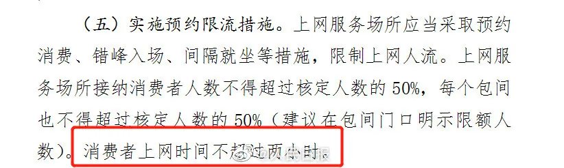 其中明确表示,消费者在娱乐场所、网吧的时间不得超过2小时。歌舞娱乐场所接纳消费者人数不得超过核定人数的50%,每个包间接纳消费者人数也不得超过核定人数的50%等。