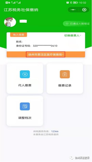 4.完成“实名认证”后,默认出现“本人”登记信息,点击“切换缴费人”,“添加他人身份信息”可切换至他人身份,点击界面中的经办机构进而为他人缴费。贾汪区缴费人应选择“徐州市贾汪区医疗保障局”经办机构。