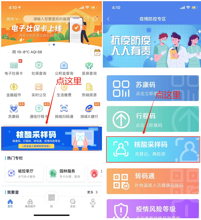 首页点击“核酸采样码”进入“疫情防控专区”,点击“核酸采样码”进入页面。