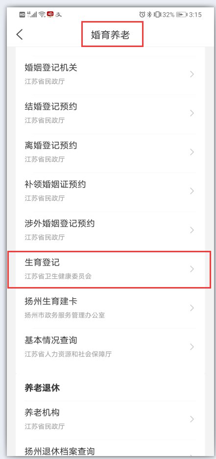 第二步:进入江苏政务APP,左上角选择“扬州市”,然后点击【婚育养老】