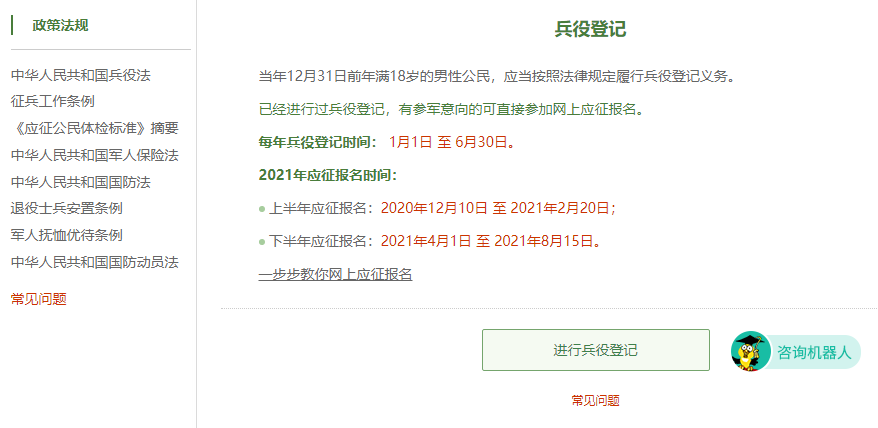 温馨提示:2021年全国征兵网网上登记报名于2020年12月10日开始。