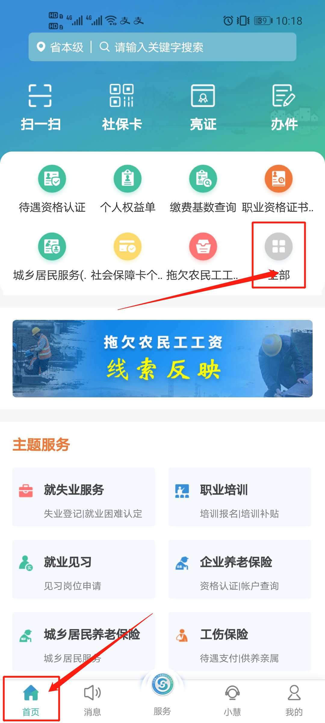 3.登录成功后点击下方的“首页”,进入首页,点击“全部”功能按钮,进入主题服务专栏