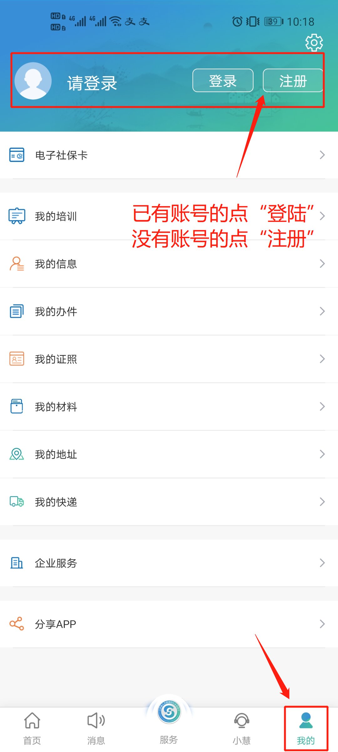 2.进入江苏智慧人社点击下方“我的”,完成登录及相关认证要求。