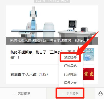 在公众号下方菜单栏点击“患者服务”——“预约挂号”