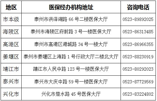 泰州市医疗保险经办机构地址及咨询电话: