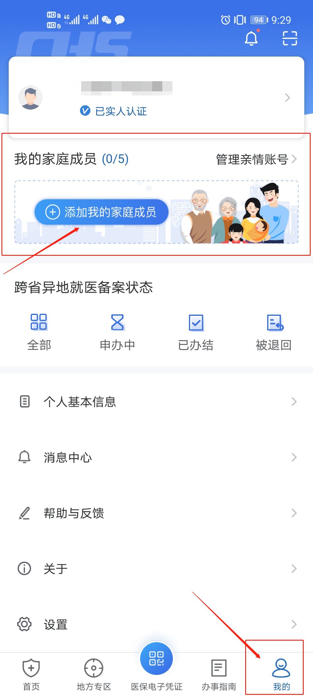 3、完成登录后,点击底部菜单【我的】进入个人中心页面,在【我的家庭成员】版块点击图标“+”添加亲情账户。请根据说明选择合适的绑定方式,然后点击【确认】按钮。仔细阅读文字提示,上传相关材料,完成绑定。