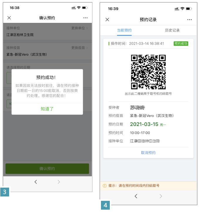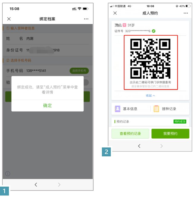 在成人档案列表中选择需要预约的档案,选择“我要预约”——“确认预约”就完成了,去接种单位出示预约的二维码扫码即可。