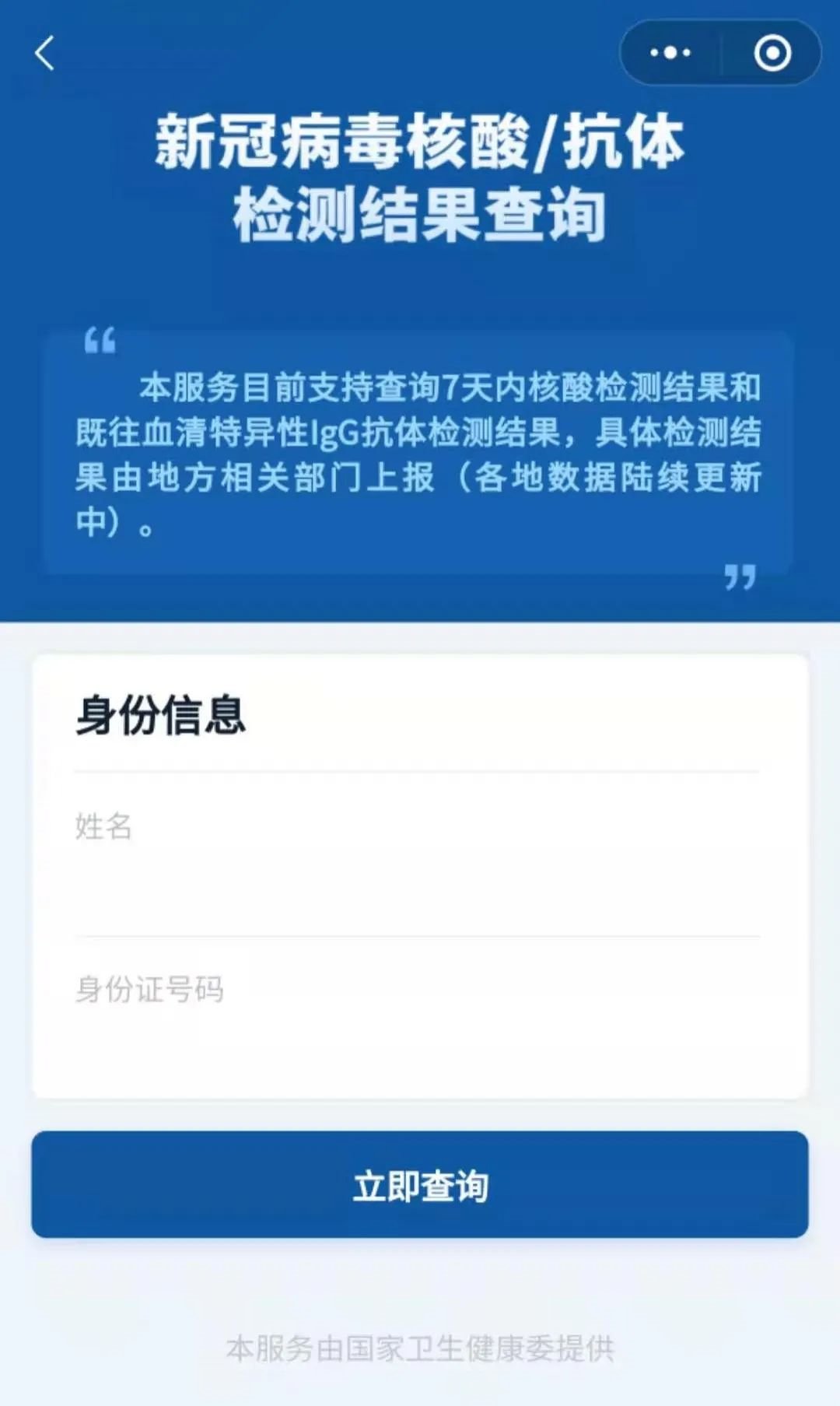 查询入口:点击进入(可能存在延时),进入首页后,输入个人信息即可查询自己的核酸检测报告。
