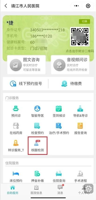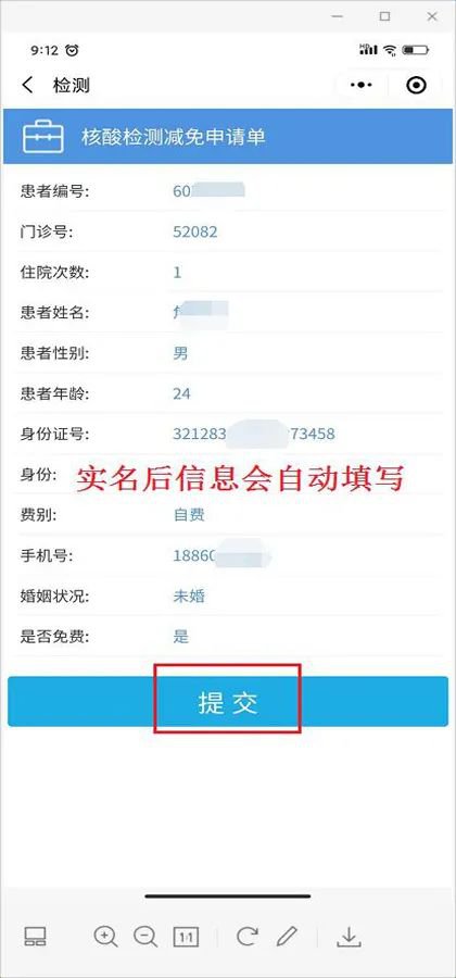 2、实名认证后的患者信息会自动填写,直接提交即可。申请成功,患者微信小程序中将会收到核酸检测申请的通知。患者凭手机上的二维码可直接进行核酸检测。