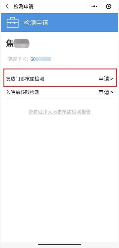 如果是在发热门诊就诊需申请核酸检测,请选择“发热门诊核酸检测”;