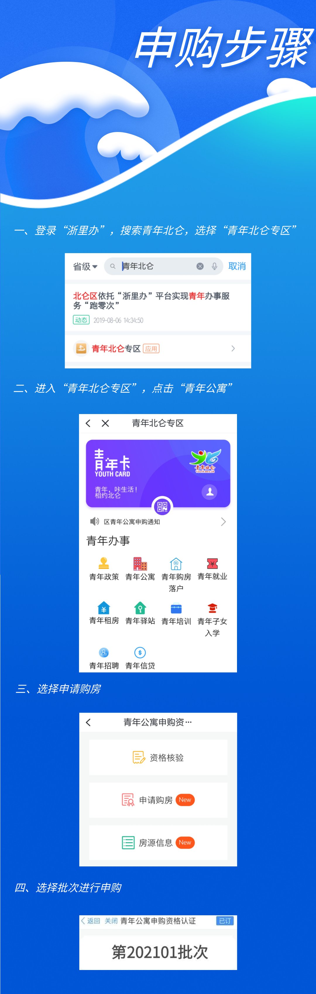 登录“浙里办”APP,通过 “北仑区青年公寓在线申请”系统进行申购(步骤见下图)。