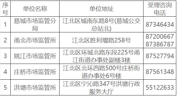 (一)宁波市江北区市场监督管理局 地址:宁波市江北区胜利堰路268号 电话:87625137(仅限咨询);