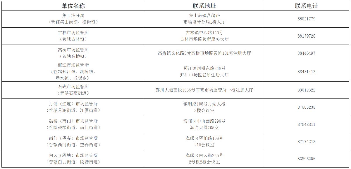 (二)海曙区各市场监管所(分局)联系方式。