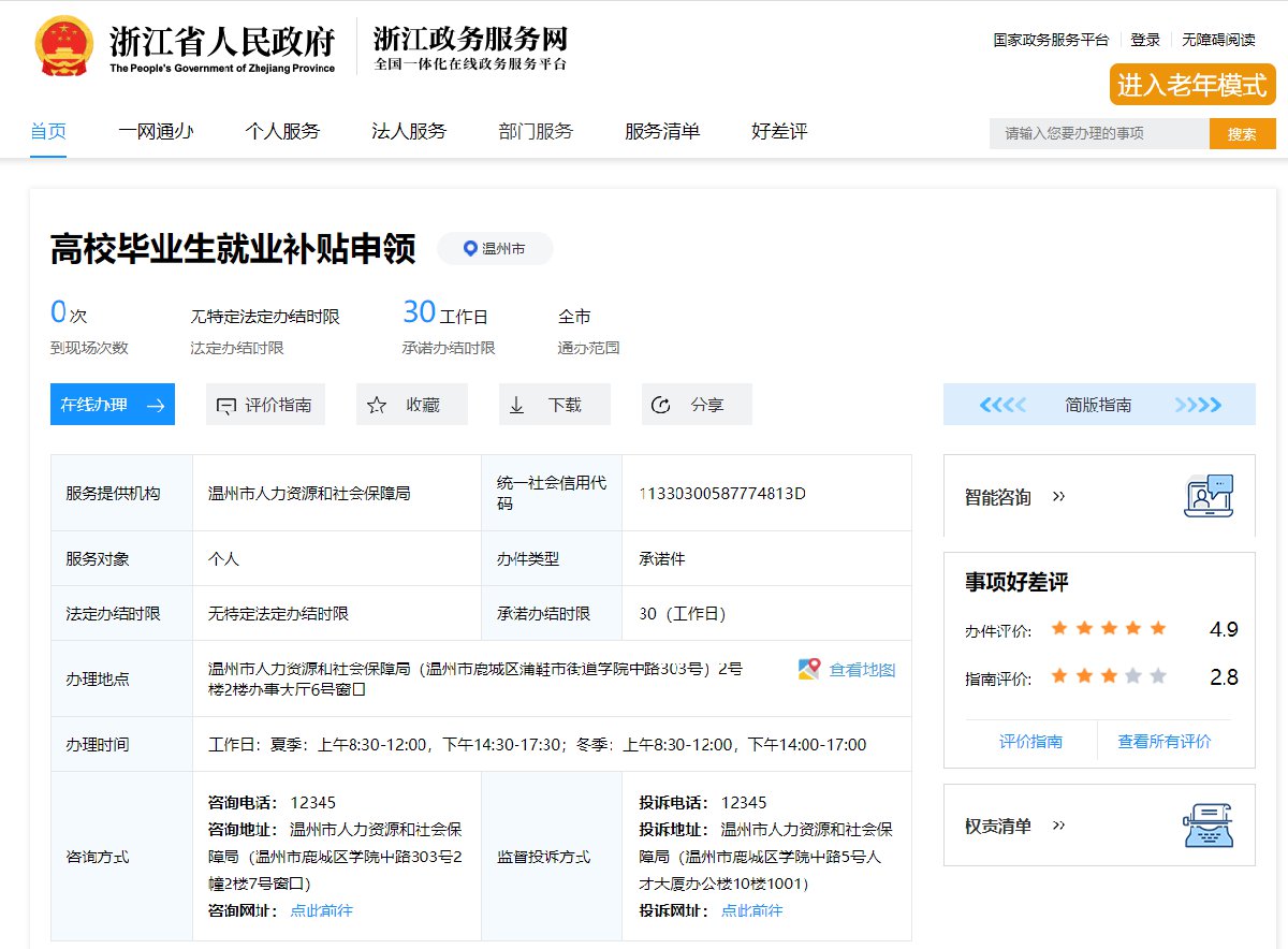 线上申报入口:http://www.zjzwfw.gov.cn/(搜索“高校毕业生就业补贴申领”)