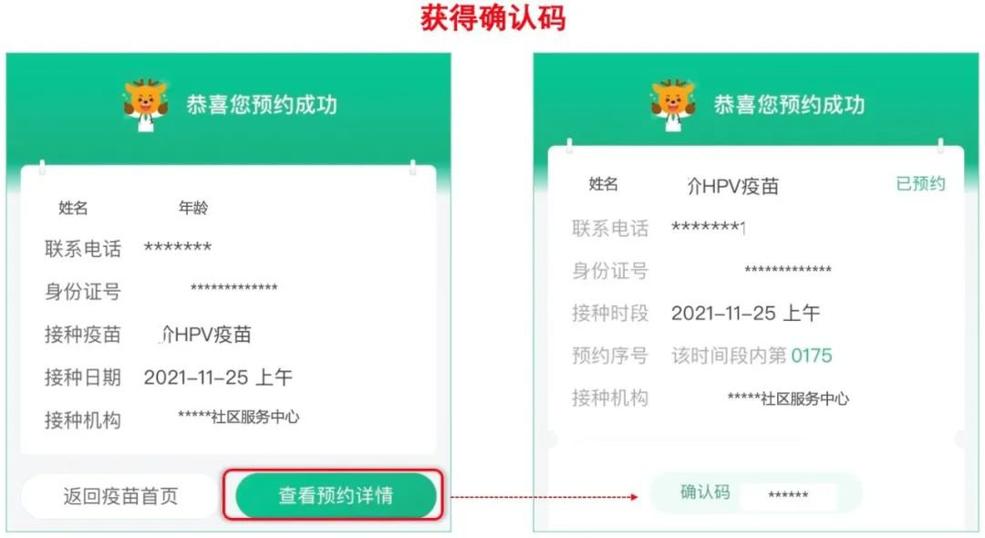 4、预约成功:预约成功后,点击“查看预约详情”,获得确认码,之后请携带相关证件,按预约时间准时前往接种点接种。