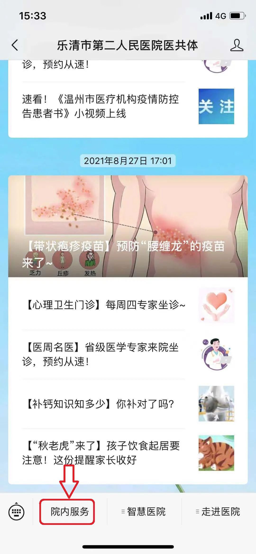 也可以通过乐清市疾病控制中心微信公众号预约我院疫苗。