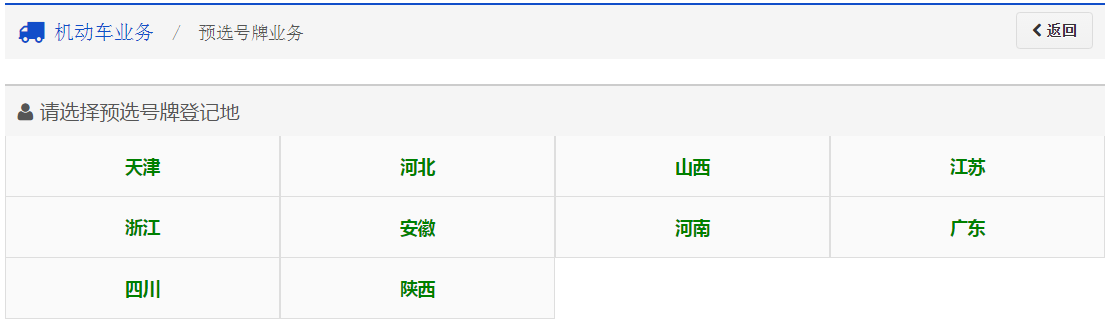 点击上图中红色标示的“跳转到其他省市”链接,进入全国省市互联网服务平台选择界面。 用户根据本人新能源汽车需要换牌选号的车管所选择相应的省市,系统会自动跳转到用户选择的省市互联网服务平台的预选号牌首页。如下图所示:
