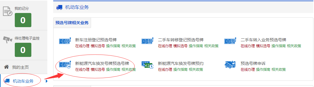 互联网注册用户在互联网登录后,点击【机动车业务】→【新能源汽车换发号牌】下的【预选号牌】进入预选号牌流程。