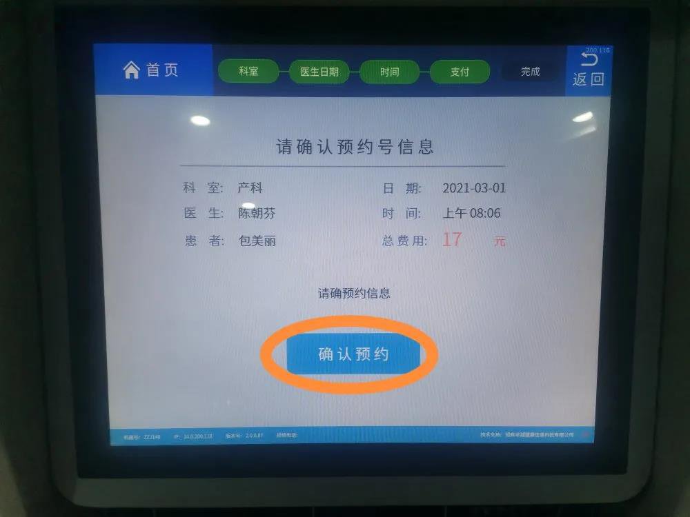 插卡—预约—预约挂号-选择科室(可输入就诊科室的拼音首字母进行查找,比如产科即输入字母出口)—选择医生及就诊时间—选择号次—确认预约。