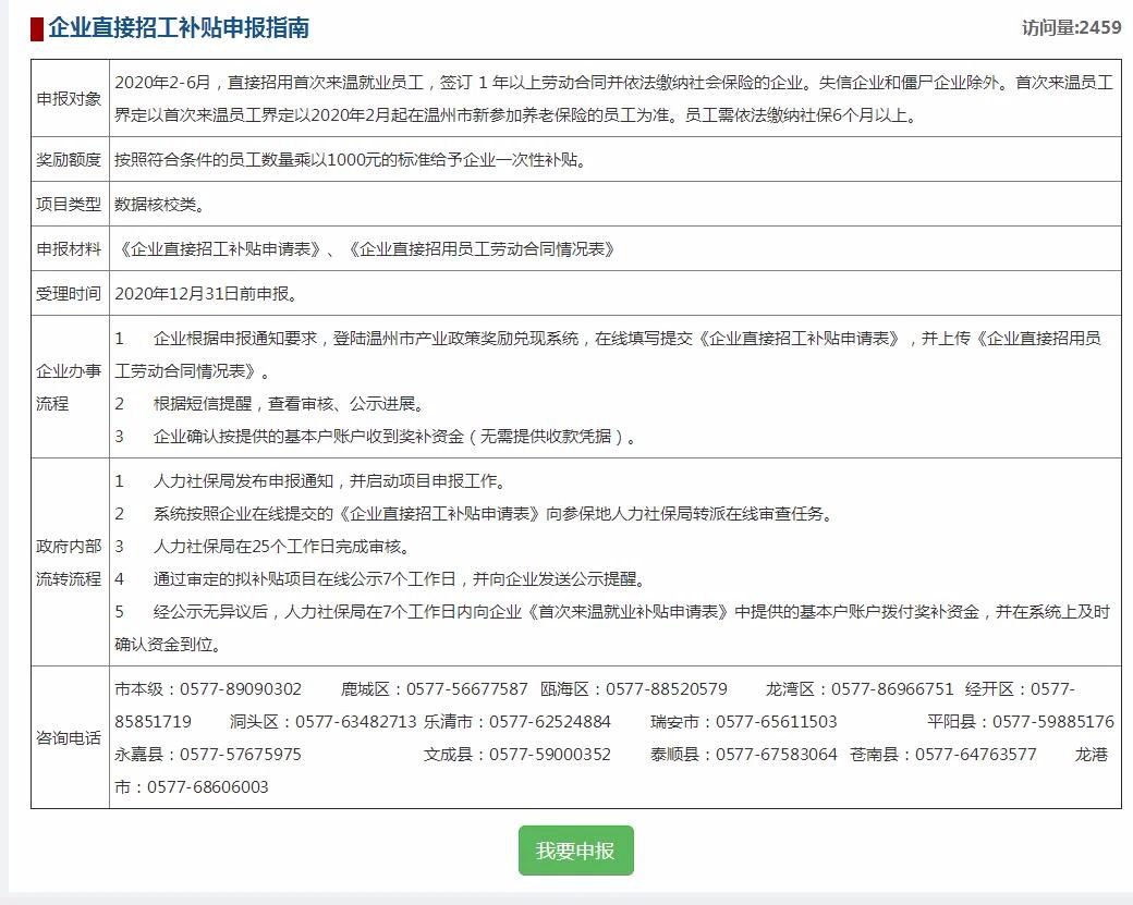 2020年2月至6月,温州市企业直接招用市外首次来温就业员工、签订1年以上劳动合同并依法缴纳养老社保6个月以上的,以每人1000元的标准一次性给予企业补贴。