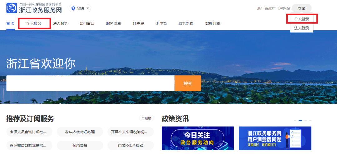 步骤1:登录浙江政务服务网,点击右上角个人登录,完成注册、登录;