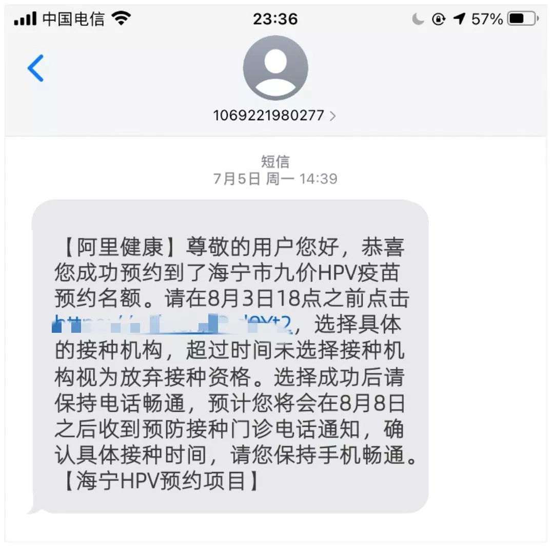 4、预约成功后,海宁户籍用户将获得一条成功预约的短信,通过短信中链接预约具体接种机构,完成选择后务必保持电话畅通,耐心等待预防接种门诊联系,确认接种时间。