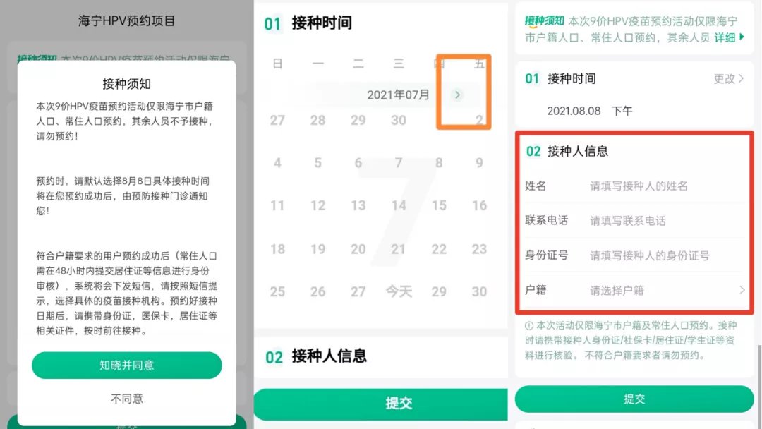 3、抢苗活动开始时,点击抢苗助手,可以看到公告弹窗。符合条件的用户,点击知晓并同意用户接种须知,按图示翻至8月份的日历,点击8月8日下午的时间段进行预约。然后再填写接种人信息,仅限预约者本人身份信息填写。