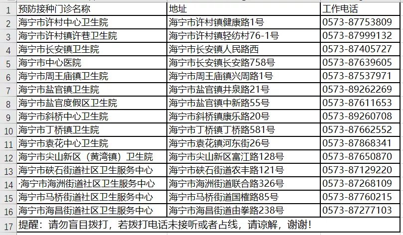 2、海宁市9价HPV疫苗预防接种门诊一览表: