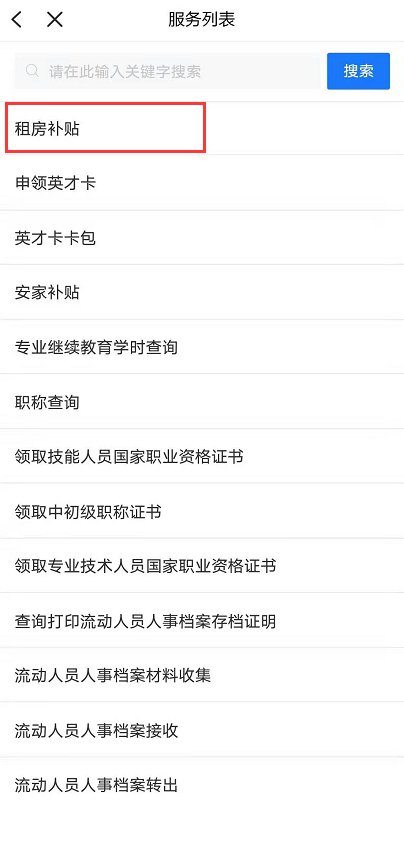 4、进入“人才服务”栏目后,点击或搜索“租房补贴”。