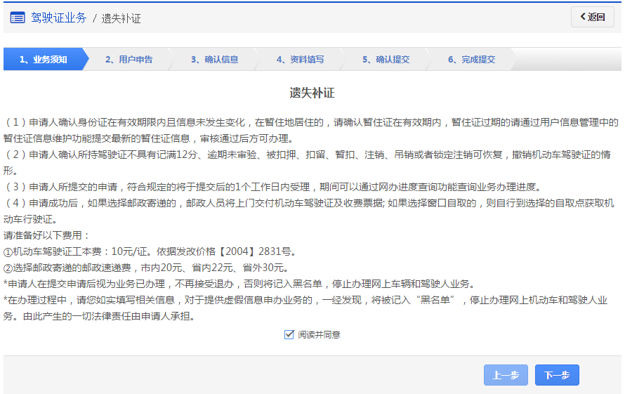 在该步骤,用户需认真阅读其内容,包括:办理遗失补证需要注意的各项内容和相关责任,如下图所示。同意的,勾选“阅读并同意”,点击【下一步】进入步骤2【用户申告】。